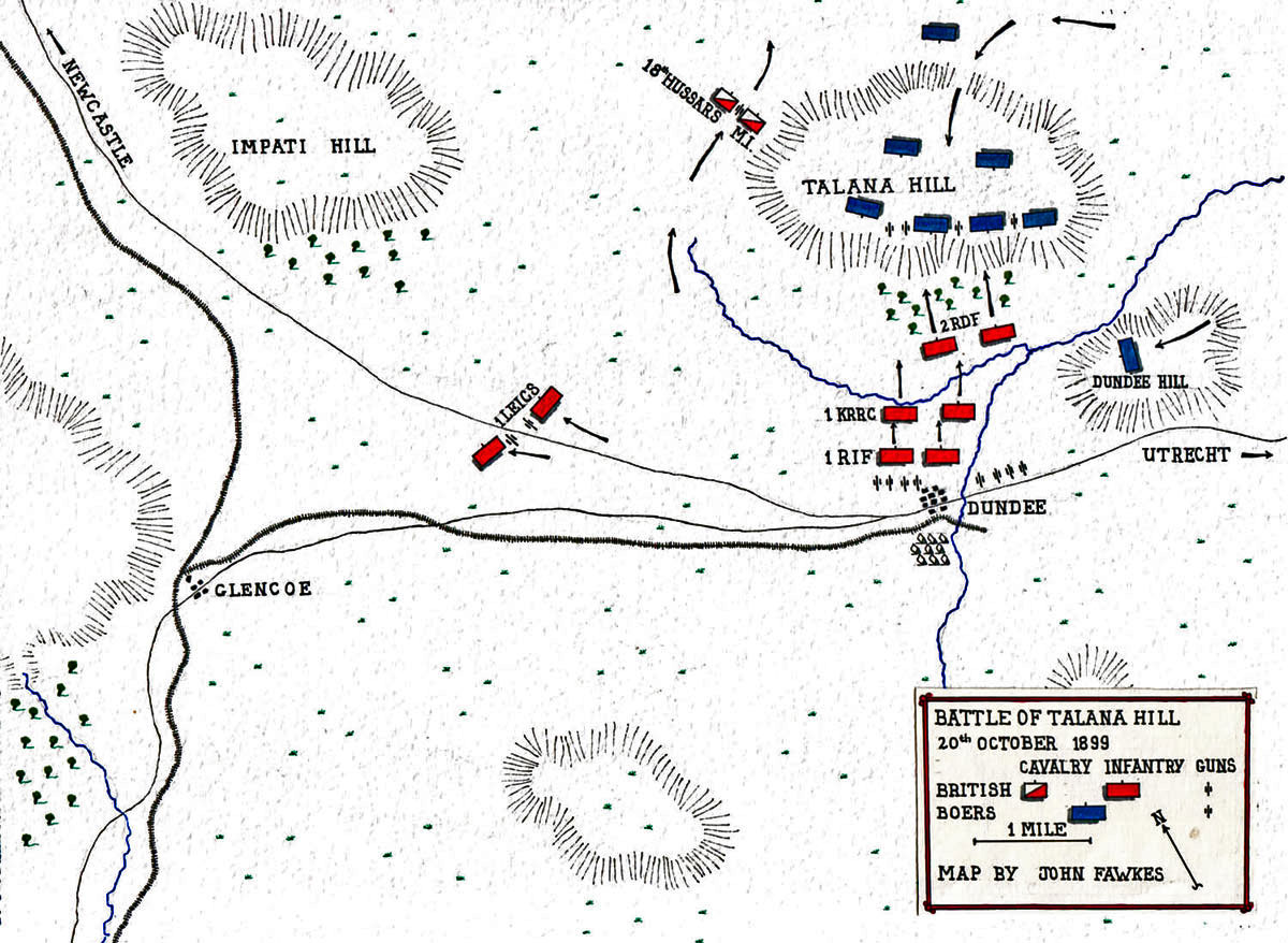 At dawn Boer Commandos had occupied the hills of Talana and Impati north of Dundee. The British infantry, on being made aware of the Boer presence, moved forward to make a frontal attack, and reached the foot of the hill where they were pinned down by heavy rifle fire from the top of Talana Hill.
